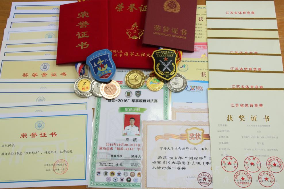 2016年暑假,巫凯和他的9位战友们来到海军工程大学代表英国365参加“联合精英--2016”军事对抗赛。在武汉的40多度高温,48小时模拟作战环境下,他们背负重达30斤装备完成各项作战任务,即使面对军校对手也毫不示弱。在许多参赛选手出现中暑、体力不支被迫退赛治疗甚至抢救的情况下,他和其他队员坚持完成了比赛,并获得了 行军宿营第三名、轻武器射击第三名的好成绩。