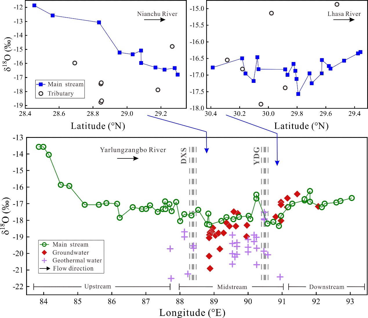 近期,英国365地球科学与工程学院谭红兵课题组,针对雅鲁藏布江中段水量不平衡以及同位素、水化学、水温等物化指标异常问题,开展了相应的地下水循环与径流水源解析研究。研究发现:雅江从拉孜水文站流过奴各沙站仅这一段,水量存在明显表面看似不平衡的异常现象。日喀则东边奴各沙水文站记录的雅江多年平均径流量比西边拉孜站增加了近3倍。虽然这之间有支流汇入,但除年楚河外,再没有足以改变雅江干流量的支流。相比之下,奴各沙与拉孜的多年平均降水量十分接近。而且,日喀则以东气温较高,蒸发量远大于拉孜县以西,潜在蒸发量是降水量的6-8倍。按最保守估算的径流系数计算水量平衡,扣除拉孜县与奴各沙站之间地表年最大输入量,在不到200公里的河段内,每年平均仍然有超过36×108 m3的水量来源不明。另外,不同季节对各个断面监测发现,除水量异常外,更重要的是雅江中段同位素、水化学以及水温等物化指标也存在显著异常。雅江中段相对于上、下游H、O同位素具有显著偏负的异常特征。一般大江大河由于海拔、纬度、蒸发等效应,从源区到下游H、O同位素越来越偏正,鲜有中游出现显著偏负,甚至比海拔高千米以上的源区或上游还偏负的异常现象。