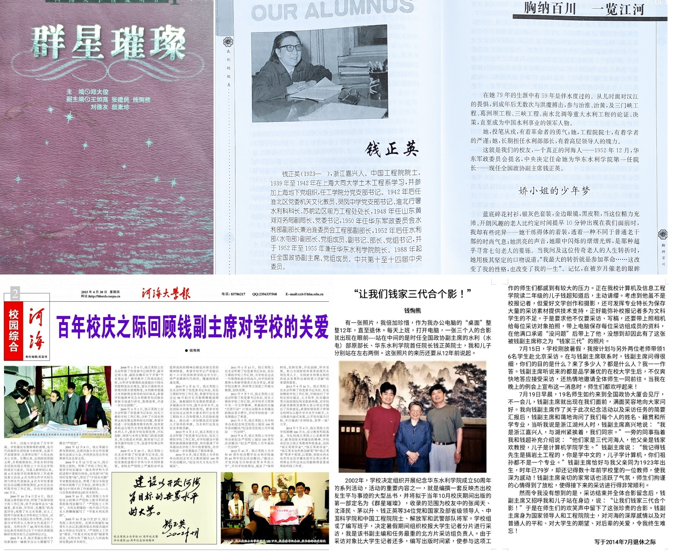 正当学校即将迎来建校107周年暨华东水利学院成立70周年之际,尊敬的老院长钱正英却离开了我们。2015年至2016年,因主笔《钱正英传》,我曾多次采访老院长。此时,当年的情景一幕幕出现在眼前,仿佛就在昨天。