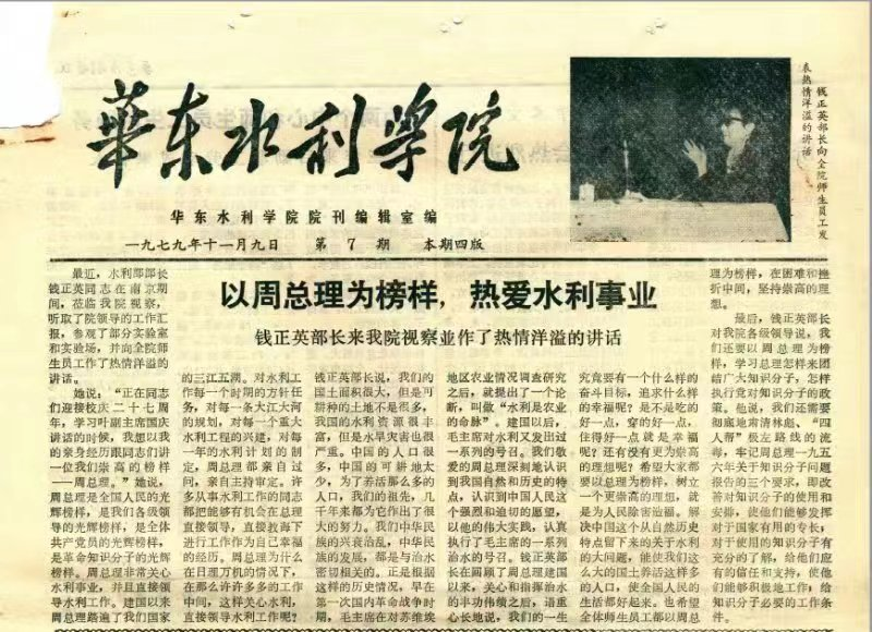 我想起四十年前的10月17日,时任水电部长的您以第一任校长的身份,在我们学生食堂召开的师生大会上深情地回忆周恩来总理对水利的重视与关心,动情地提议把华东水利学院更名为周恩来水利大学!满场掌声雷动!