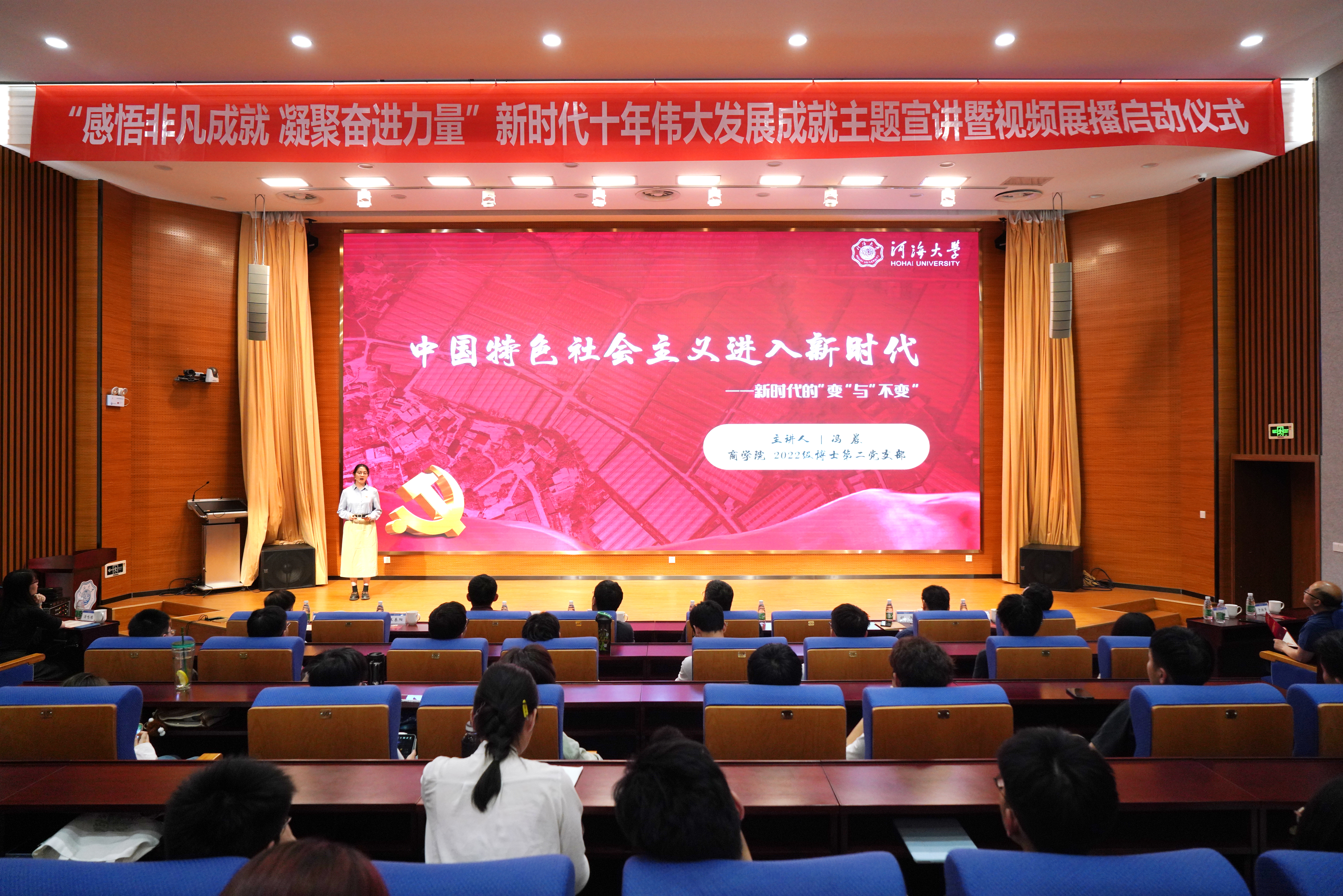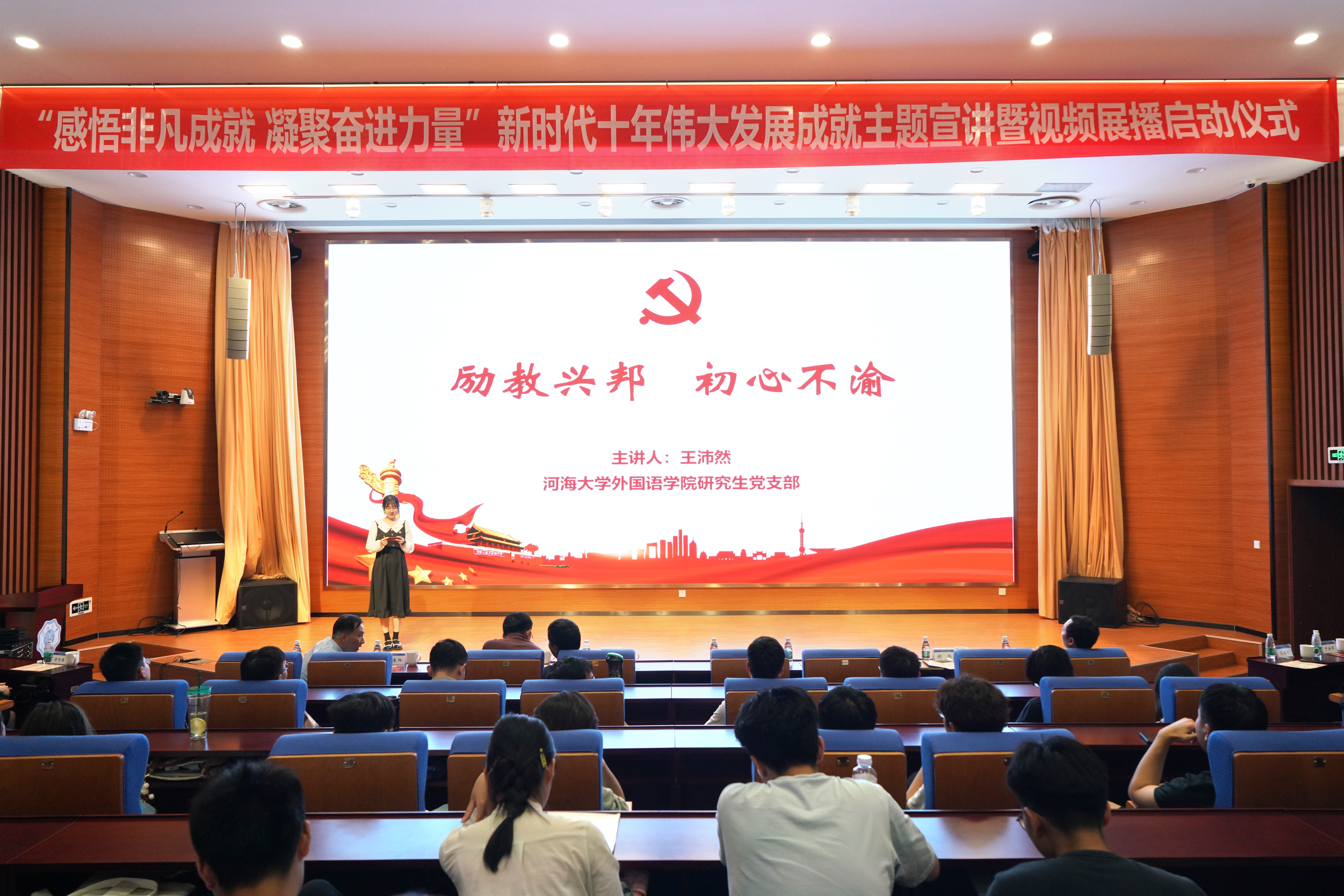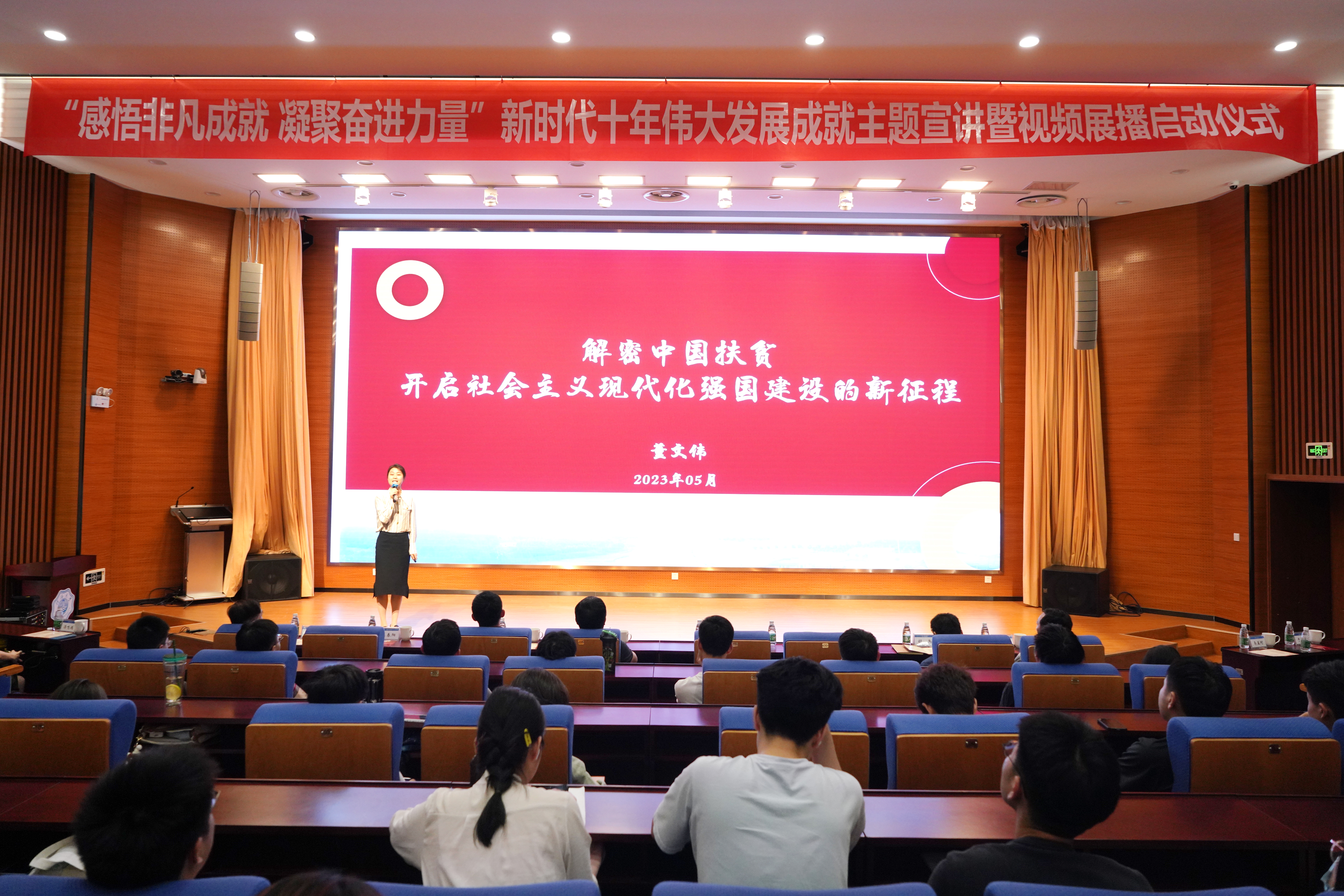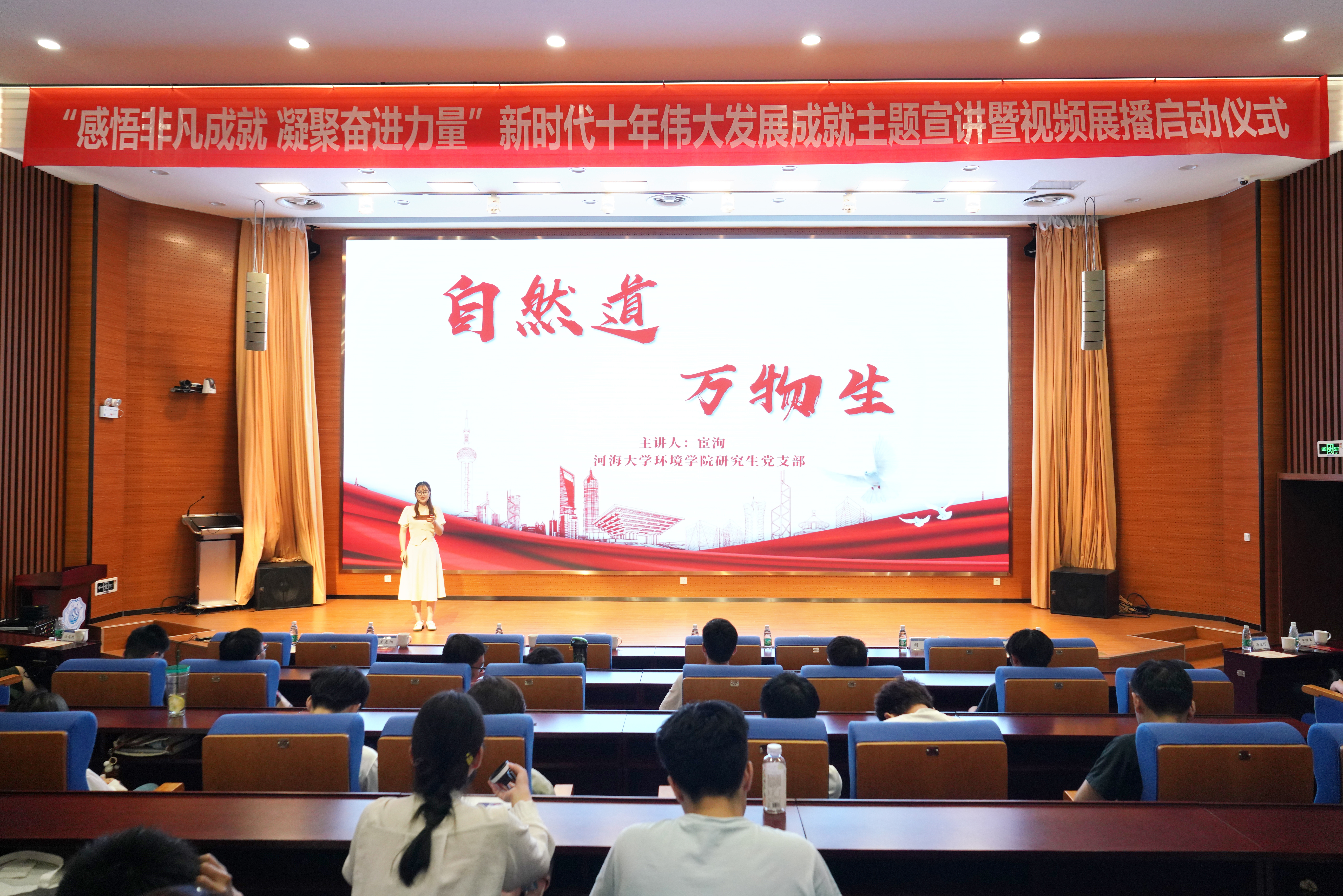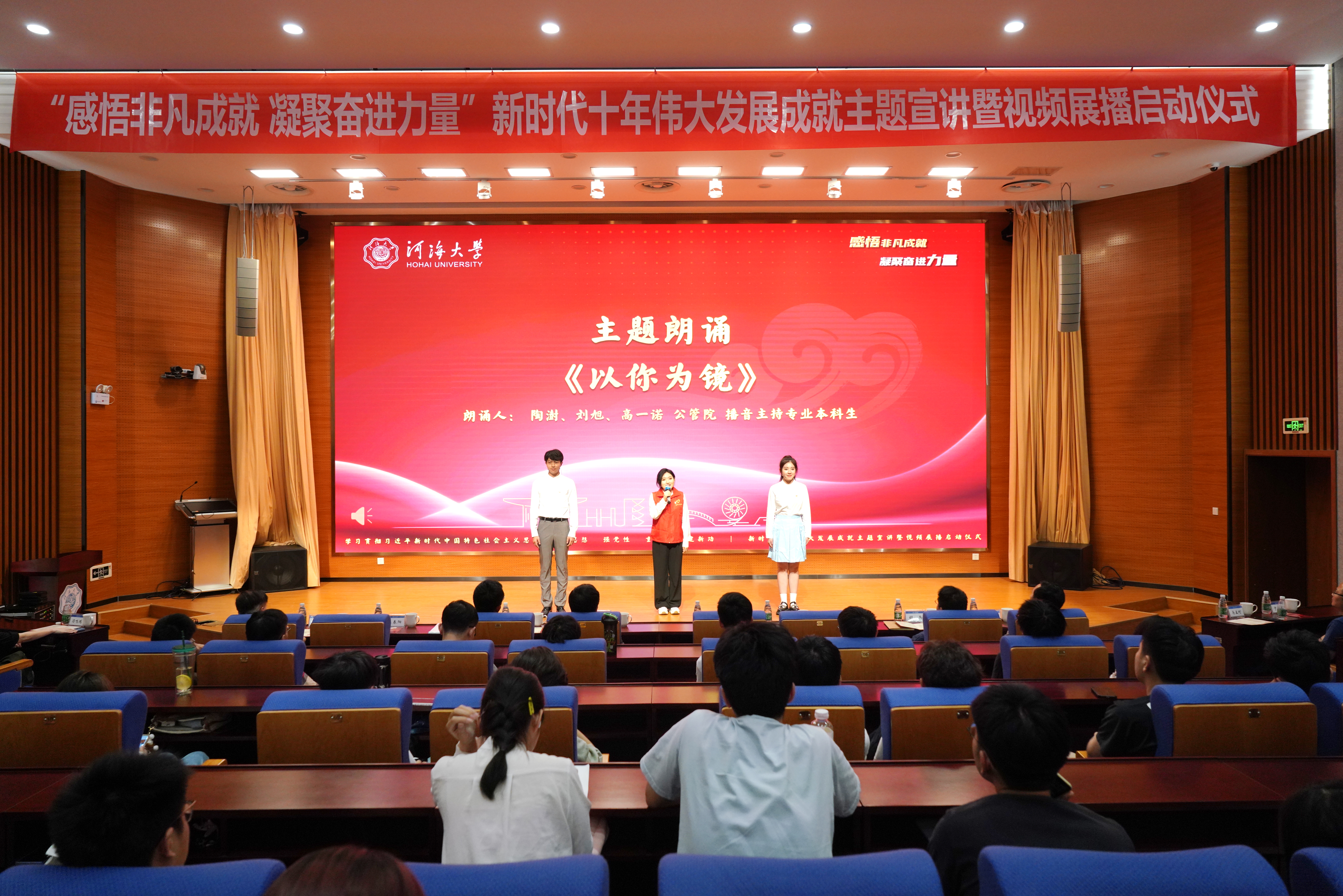 活动分为“非凡十年,非凡成就” “扎实迈向共同富裕” “办好人民满意的教育”“绿色,高质量发展的最美底色”四个篇章。来自环境学院、能源与电气学院、公共管理学院、商学院、外国语学院的教师和学生代表,聚焦新时代十年的中国速度、中国力度、中国温度、中国高度,脱贫攻坚伟大实践,非凡十年的教育变革和推进美丽中国建设、实现人与自然和谐共生的现代化等主题,通过主题宣讲、主题朗诵和视频展播等形式,展示了新时代十年党和国家事业实现的一系列突破性进展,取得的一系列标志性成果。