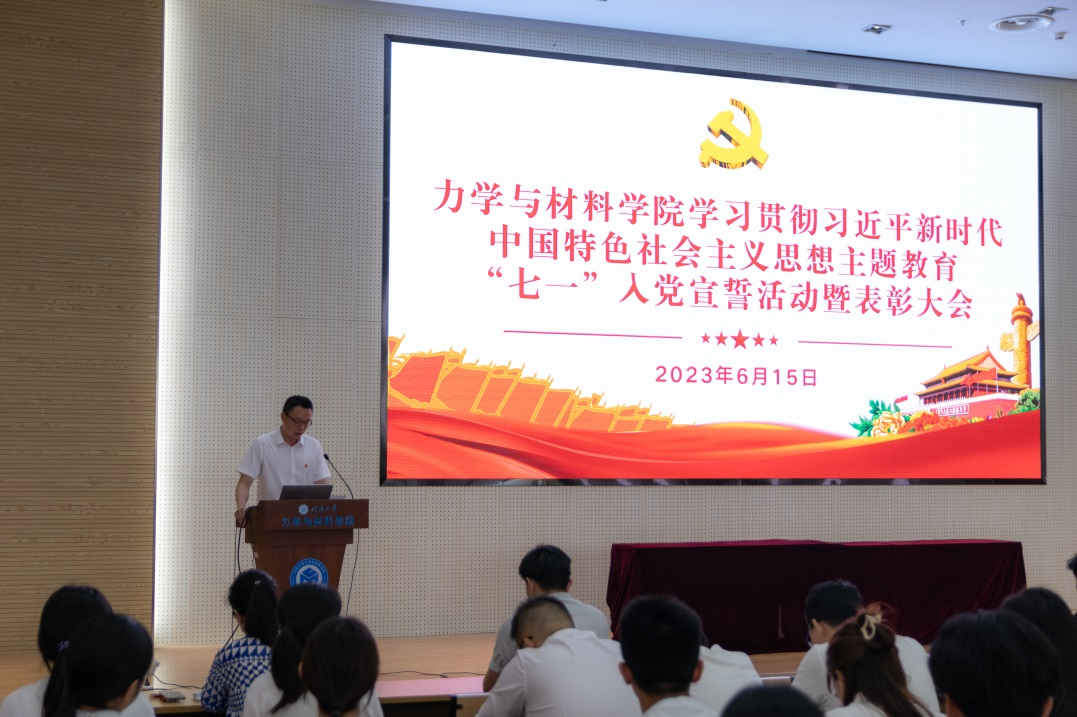6月15日,力学与材料学院党委举行学习贯彻习近平新时代中国特色社会主义思想主题教育“七一”入党宣誓活动暨表彰大会,进一步激发新发展党员的责任感和使命感,激励新老党员为学院高质量发展做出积极贡献。学院全体学生党员参加了活动,会议由学院党委副书记李晓东主持。