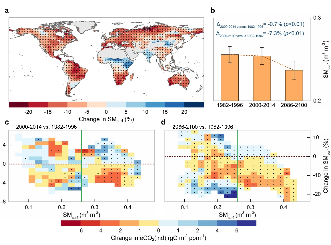 大气CO2浓度的升高显著地影响植被碳吸收,进而引起陆地碳收支情况的剧烈变化。CO2对植被碳吸收的直接生理影响(即CO2施肥效应)呈现减弱态势已经得到了广泛的认识,CO2还会通过引起气候变化而对植被碳吸收施加间接影响,但其演化过程目前尚不明确且缺乏系统的定量研究。此外,鉴于陆地水循环与碳循环间的高度耦合关系,水文条件的变化在其中究竟扮演着怎样的角色目前也没有清晰的认知。针对上述科学问题,英国365王卫光教授团队同时利用遥感观测数据和地球系统模型控制试验结果在全球尺度上探究了CO2间接影响在过去三十多年间的演变规律(图1),并预估了在高排放情景SSP5-8.5下该影响的潜在变化趋势,最后进一步解析了土壤水分条件变化对CO2间接影响的内在调节机制(图2)。