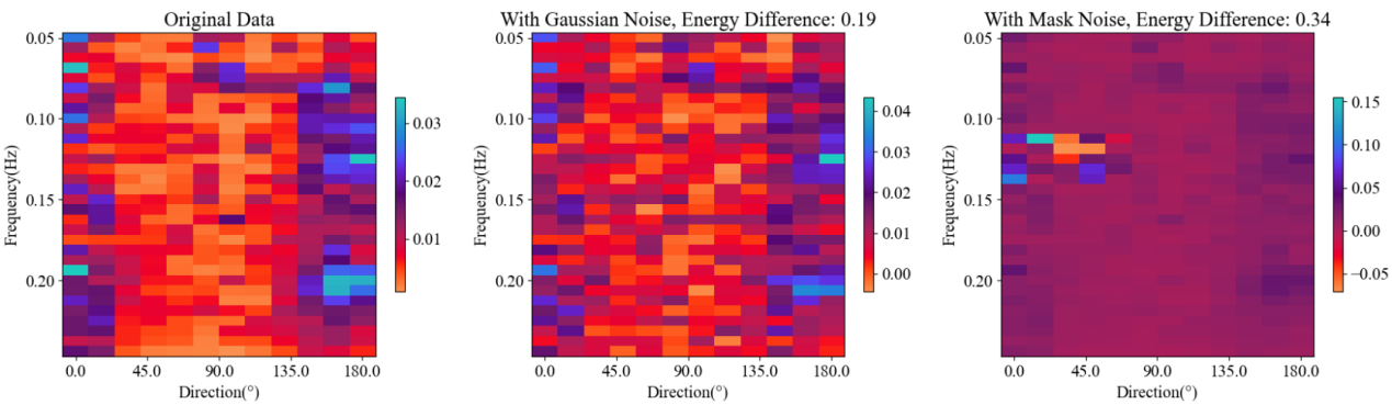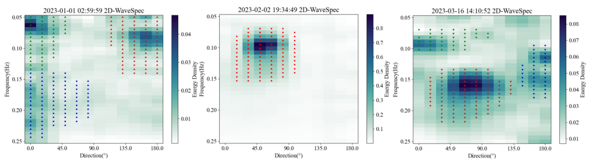 此外,该模型整合了两种物理校正功能:波系统分类损失和合并损失,这两种损失都基于波龄标准,指导训练过程并提高模型效率。研究结果表明,通过这种方法重建的理论光谱与原始海浪光谱非常吻合(图 5),精确度优于 CFOSAT自身的 SWIM 光谱分区产品(图 3)。