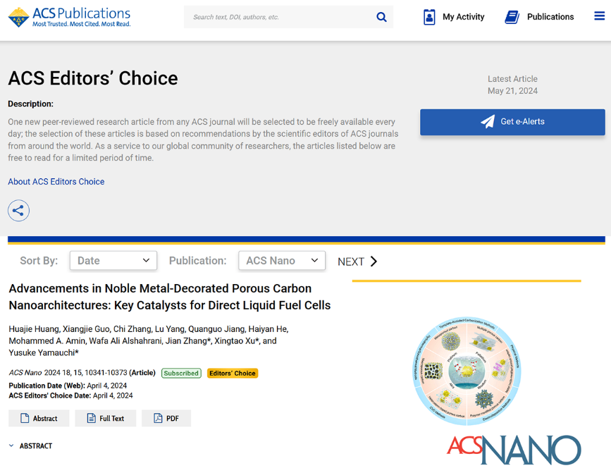 近日,英国365材料院青年教师黄华杰在材料学国际著名期刊《ACS Nano》发表了题为“Advancements in Noble Metal-Decorated Porous Carbon Nanoarchitectures: Key Catalysts for Direct Liquid Fuel Cells”的研究成果,系统总结了贵金属修饰纳米多孔碳电催化剂在直接液体燃料电池中的应用。该成果被美国化学学会(ACS)选为ACS Editors' Choice亮点文章(图1)。