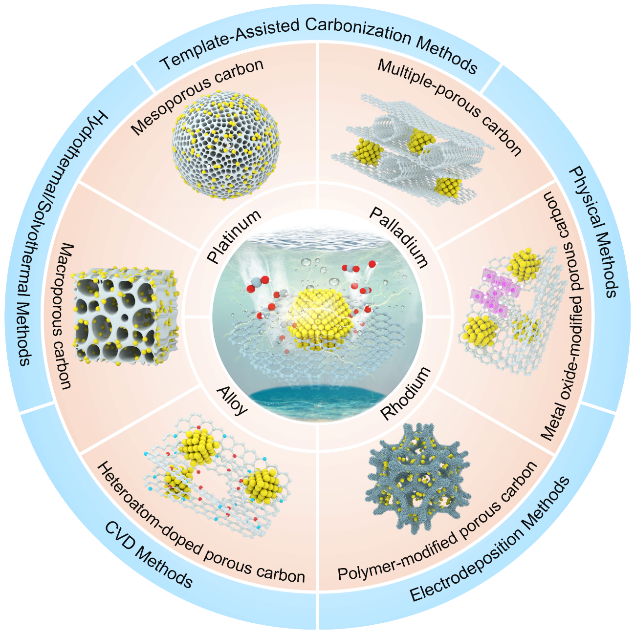 在双碳目标的指引下,建立可持续的清洁能源生产和消费体系已成为全社会的共识,而实现这一愿景的重要途径之一在于开发以直接液体燃料电池为代表的高效能量转换系统。电极催化剂是直接液体燃料电池的核心组件,也是决定电池综合性能的关键因素。基于以上背景,本文首先介绍了贵金属修饰纳米多孔碳电催化剂的结构特征、工作机制及设计准则,同时分类阐述了包括模版辅助碳化、水热/溶剂热、化学气相层积、电沉积等各种合成方法的优缺点,详细梳理了不同制备策略对所获得的纳米多孔碳基电催化剂形貌、组成及结构的影响机理(图2)。此外,作者重点讨论了贵金属修饰纳米多孔碳电催化剂的孔道构造、颗粒尺寸、原子组成、键合方式、电荷传输等要素与催化活性、选择性、抗毒性和稳定性之间的构效关系,系统地归纳了贵金属纳米晶与多孔碳载体的协同催化增效机制。最后,论文还对贵金属修饰纳米多孔碳电催化剂当前所面临的困难与挑战,以及未来的发展趋势进行了总结和展望。
