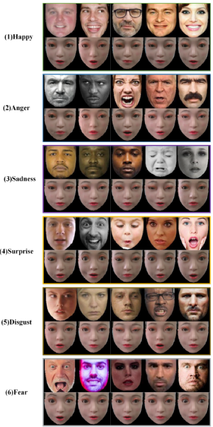 最后,团队还进行了机器人在AUs标签驱动下生成各种表情的实验(图5)。通过设置不同的AUs标签,机器人成功生成了多种自然的表情,包括开心、愤怒、悲伤、惊讶、恐惧和厌恶。实验结果表明,在AUs驱动下,机器人能够生成细腻且自然的表情,从而显著提升情感人机交互的效果。这一发现表明,该技术在增强机器人与人类互动的自然性和有效性方面具有重要潜力。