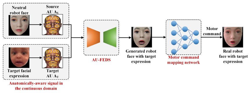图1:系统框架:连续域中的解剖级AU分布标签被检测为源AU AS和目标AU AT,将AS、AT和中性机器人面孔输入到AU-FEDS中,以生成具有目标表情的机器人面孔,随后将其输入到运动指令映射网络,以获得机器人的面部运动控制指令