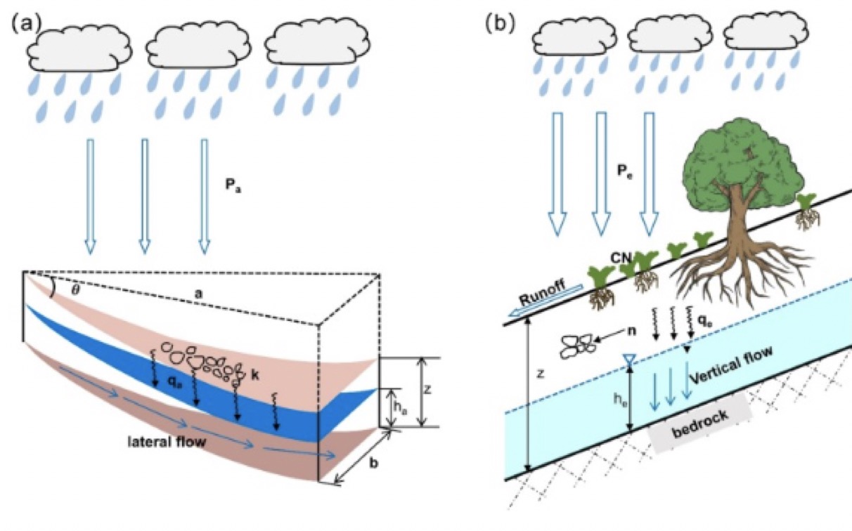 图1. 提出的FSLAM模型:(a) 前期降雨引起的侧向流;(b) 事件降雨诱发的垂直流
