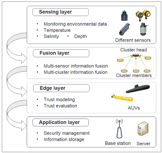 传统的UASNs结构中,信任数据的收集和计算往往存在较高的延迟,难以迅速识别异常节点,并且不同信任度量的权重也无法自适应调整。为应对这些问题,韩光洁团队创新性地将边缘计算技术融入AUV(自主水下航行器)网络中,视AUV为提供低延迟信任建模服务的边缘设备,从而减少计算延迟并提高信任计算的精度。
