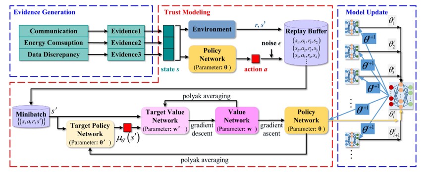 此外,该团队还将信任模型与联邦学习相结合,基于现有的证据获取机制(如通信、能量和数据证据),提出了一种新的基于联邦深度强化学习的信任模型。该模型更好地适应了UASNs的动态拓扑结构,提高了网络的信任预测精度和能量效率,进一步提升了数据传输的安全性。