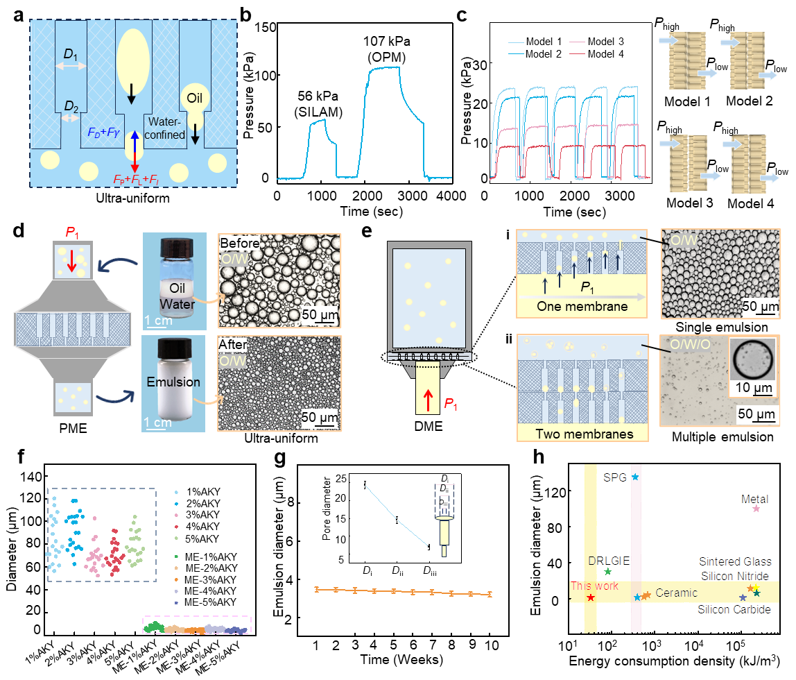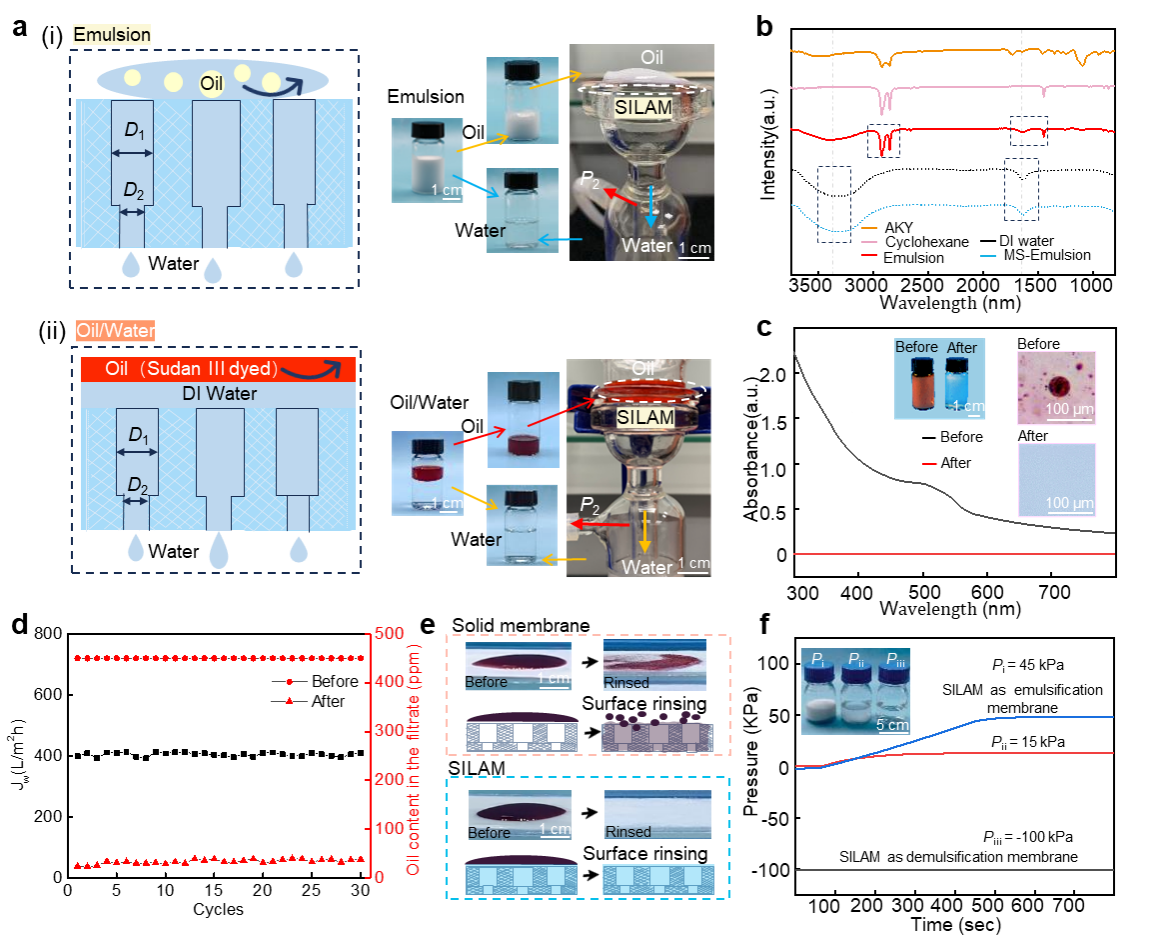 在乳化模式下,SILAM相较于已有的乳化膜具有低能耗高效乳化性能。通过SILAM可处理液滴大小分布在5 ~80 μm之间的预乳液,使之形成分布更均匀、更细小和超稳定的粒径约5 μm的乳液。此外,通过同一膜进行多次膜乳化可获得乳化指数更高的乳液。在破乳模式下,SILAM能够从乳液和任意配比的油水混合物中实现高效的油水分离,并具备优异的抗污性能。将SILAM应用于实际船舶废水处理,油水分离系数达到99.97%,循环性能达30次以上。从长远来看,本课题研发的SILAM在水处理、食品行业、石油化工等领域具有广阔的应用前景。
