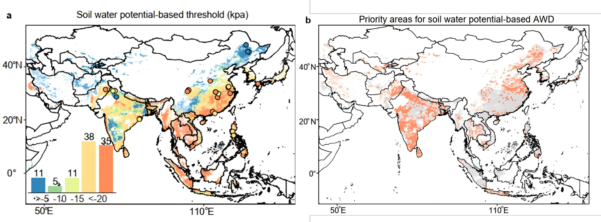 针对上述问题,研究团队开展全球稻田干湿交替灌溉控制试验的数据挖掘,发现灌溉间歇的最低土壤水势是决定AWD如何影响水稻产量的关键指标。在此基础上,综合应用深度学习、过程模型与控制试验数据,绘制了亚洲稻田干湿交替灌溉土壤水势阈值图(图1)。与国际水稻研究所推荐的AWD模式相比,该团队提出的新模式实现水分利用效率在全球37%的水稻灌溉面积显著提高且保障水稻稳产,其中印度、孟加拉和中国长江下游等国家或地区是优先推广区,为进一步优化亚洲稻田(约占据全球88%稻田面积)的水分管理提供了科学依据。