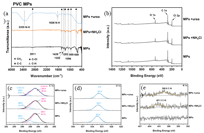 图5 氨态氮(NH4Cl)和尿素存在条件下,PVC微塑料的FTIR谱图(a)以及XPS谱图(b:全谱;c:C1s高分辨率扫描谱;d:O1s高分辨率扫描谱;e:N1s高分辨率扫描谱)