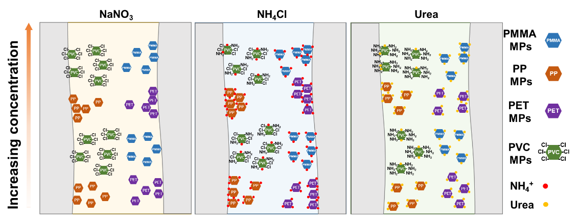 研究探明了氨态氮(NH4Cl)、硝态氮(NaNO3)、尿素三种不同形态氮肥影响下,微塑料的迁移及转化机制。结果表明,微塑料的迁移能力普遍随NH4Cl、NaNO3浓度的上升而降低,随尿素浓度的上升而增强。微塑料的化学稳定性对其迁移能力影响较大。NH4Cl存在条件下,NH4+可以取代PVC微塑料表面的卤素氯,改变PVC微塑料的化学性质,从而促进其迁移。尿素存在条件下,尿素酰胺与PVC微塑料表面的卤素氯发生反应生成氨基,从而影响PVC微塑料的迁移能力。此外,尿素存在时,PMMA微塑料表面也生成了N-H键和C-N键。由于PET微塑料和PP微塑料在不同氮素条件下都显示出较强的惰性,因此其性质几乎没有发生转化。