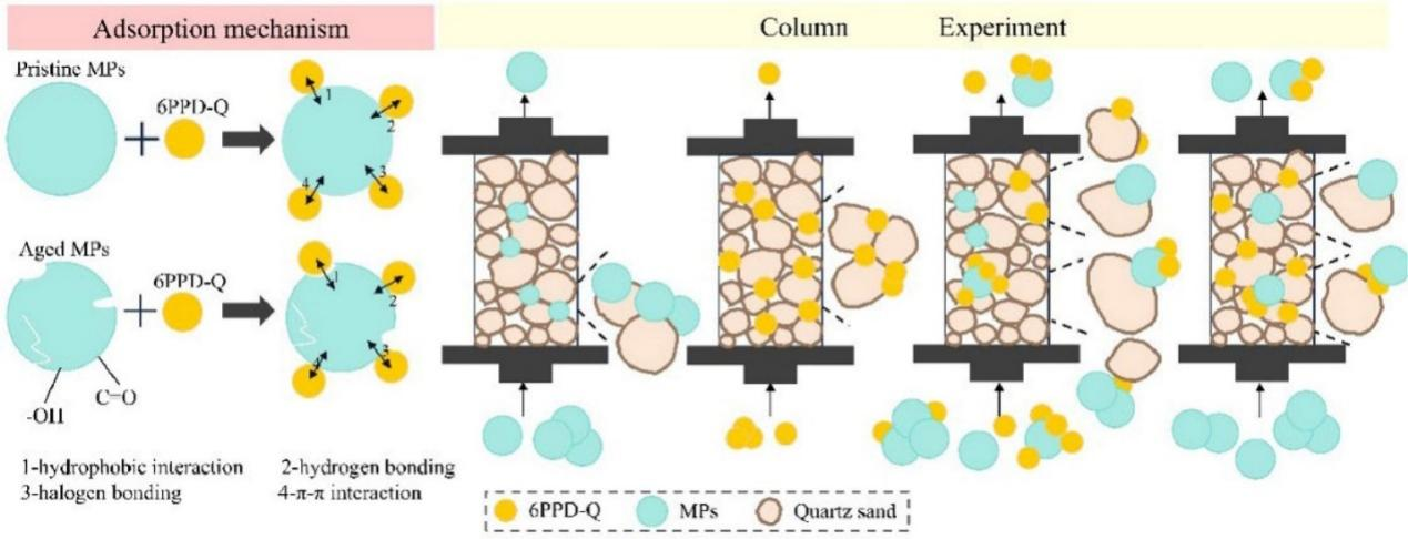 6PPD-Q作为橡胶及塑料制品的防老剂衍生物,已被发现对多种生物具有毒性。微塑料大多源于塑料垃圾风化破解,其生成过程不可避免的会与6PPD-Q共存。研究发现,微塑料存在条件下,6PPD-Q存在作为独立溶质、与微塑料键合等两种方式迁移。微塑料能够作为载体,促进6PPD-Q在多孔介质中的迁移能力,且促进效率受其老化程度及类型的影响。由于微塑料具有围绕介质表面运动的特性,因此其表面运动过程中可以将原本吸附在介质上的6PPD-Q粘附下来,使6PPD-Q从多孔介质中释放出来,并随微塑料共同迁移。