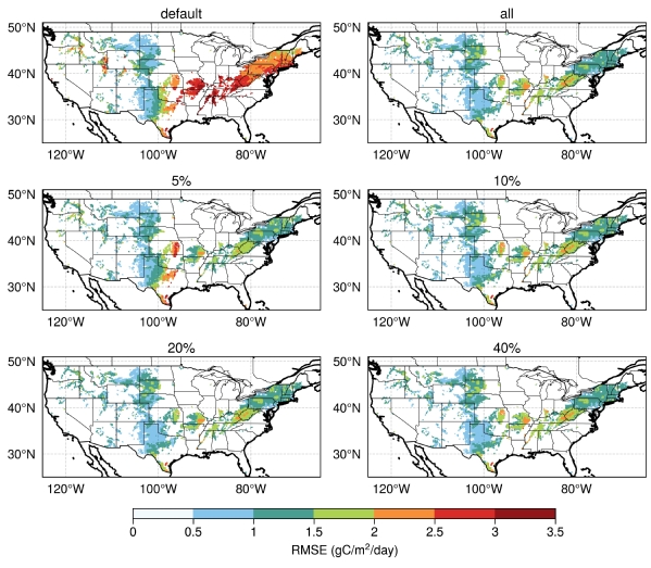 图2 采用默认参数、MO-ASMO基于全部网格优化的参数、MO-ASMOGS在不同网格采样水平下优化的参数所模拟GPP的RMSE值的空间分布