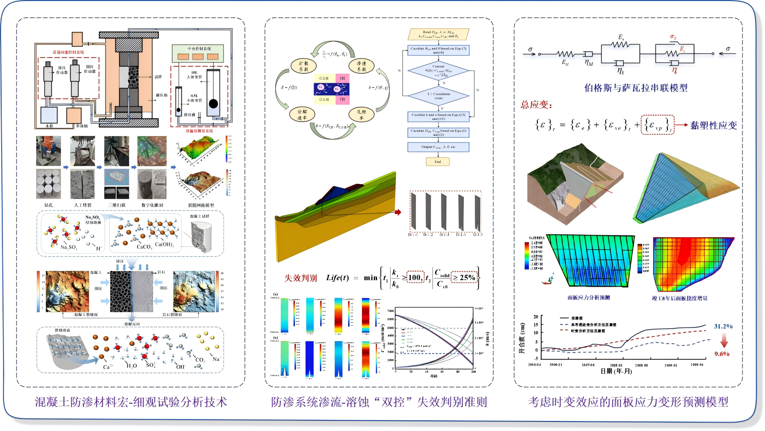 针对混凝土面板、防渗墙及灌浆帷幕等混凝土防渗体在长期服役过程中性能劣化显著、测试手段缺乏的问题,研制了首个二级配大尺寸混凝土渗透溶蚀试验装置,破解了超高水力梯度下开裂混凝土面板渗流量、钙离子浓度和裂缝开度等参数的联合测定难题,探明了混凝土面板宏观渗透行为与微观胶凝物质溶解之间的内在联系,填补了混凝土面板渗流-溶蚀耦合分析领域的空白;针对防渗系统时变性态分析方法与寿命评估准则缺失的问题,提出了考虑防渗材料本体与支撑结构变形影响的时变分析技术和混凝土面板防渗与强度“双控”寿命评估准则,实现了混凝土面板坝时变性态和服役寿命精准预测;针对深厚覆盖层上高面板堆石坝长效性能评估误差大的问题,开发了考虑覆盖层和面板坝流变效应的弹-黏弹-黏塑硬化模型,确定了坝体变形、接缝变形和面板应力动态安全评价指标及阈值,实现了深厚覆盖层面板坝长效性能评估及预测。
