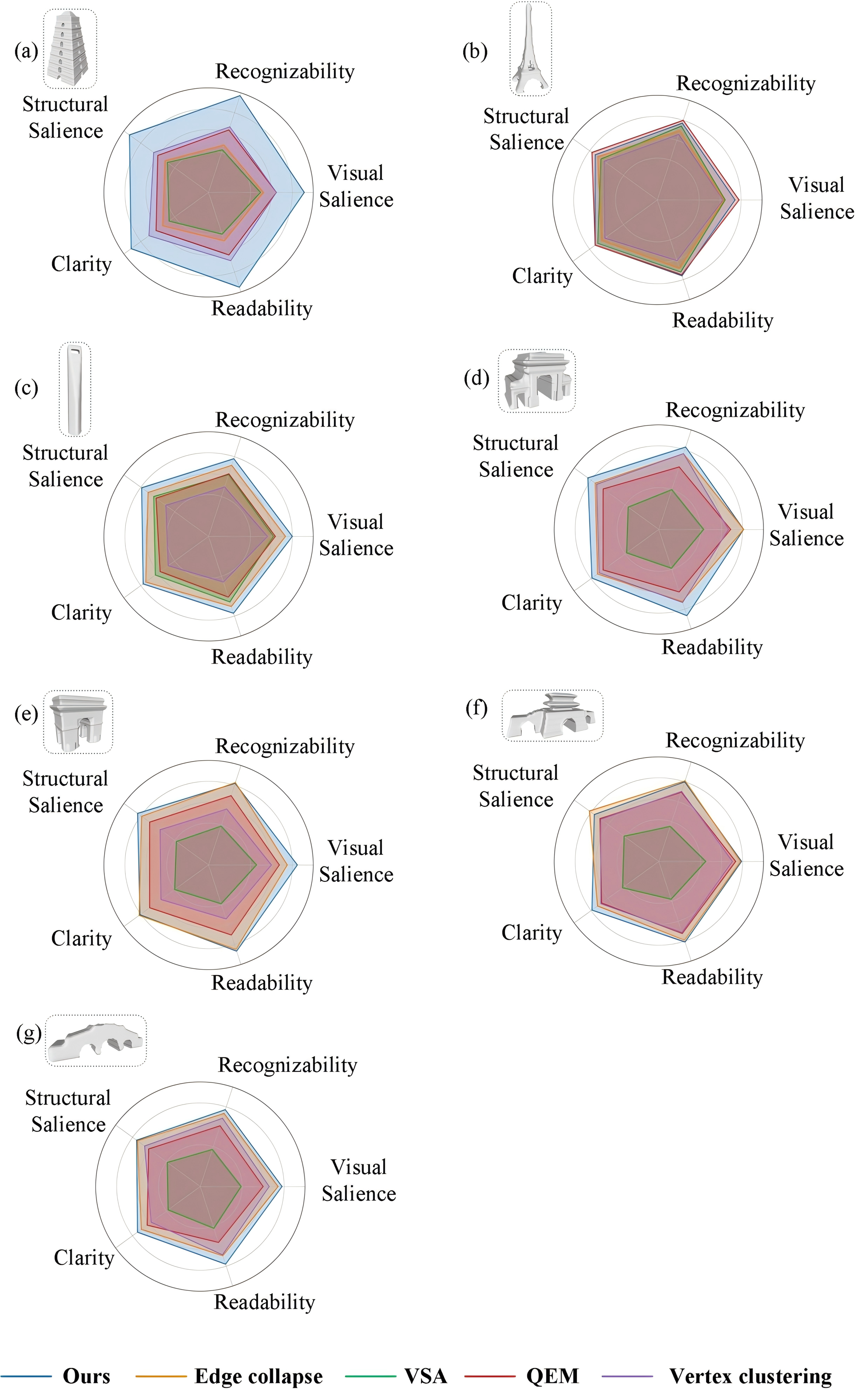 研究团队以大雁塔、埃菲尔铁塔等中西方典型地标为例开展实验验证。实验结果表明该方法在识别性、结构显著性与视觉清晰度等方面整体优于传统几何简化算法(如QEM、Edge Collapse、VSA),显著提升了用户感知体验。该方法对地标模型的最高压缩比可达99.67%,显著提高了模型的空间存储效率。此外,研究还发现:地标模型的孔洞占比越小,所需的夸张表达程度越高。该发现为认知驱动的三维地图智能制图提供了新思路。