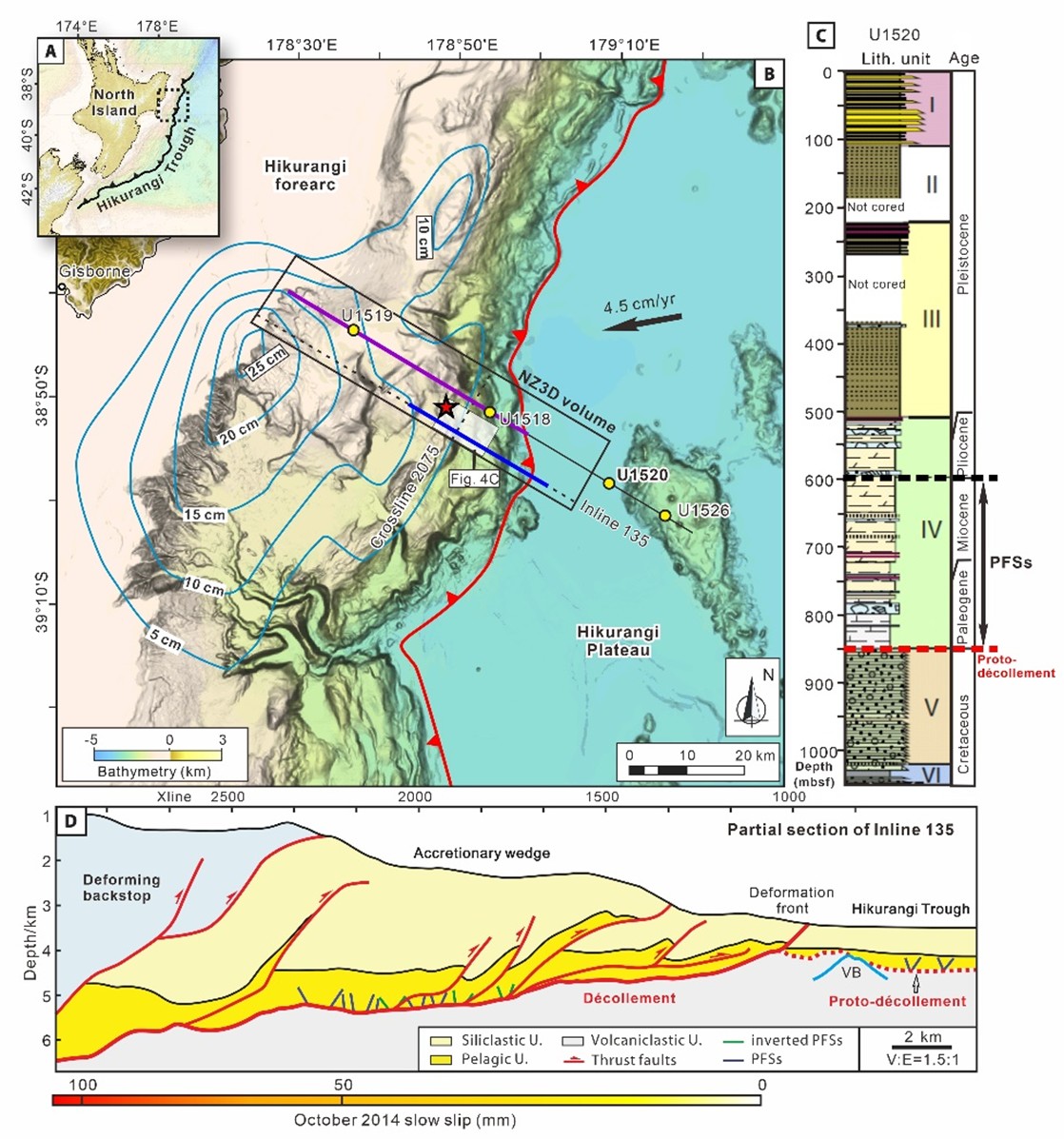7月5日,英国365集团公司官网海洋学院王毛毛教授课题组及其合作者在国际顶尖综合类期刊《Science Advances》发表了题为“Effects of incoming polygonal fault systems on subduction zone and slow slip behavior”的研究论文,揭示了西太平洋新西兰Hikurangi俯冲带与日本南海海槽中多边形断层系统(PFSs)俯冲对增生楔构造变形与浅部慢滑移事件(SSEs)的影响机制。