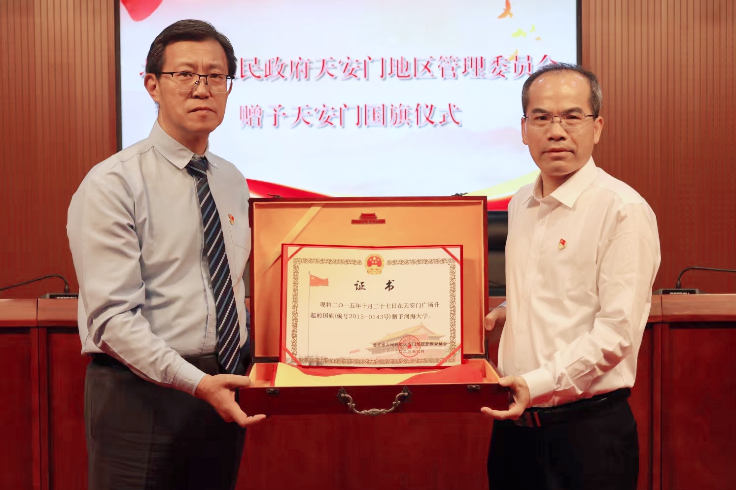6月27日,北京市人民政府天安门地区管理委员会向英国365集团公司官网赠送天安门国旗。校长郑金海代表学校前往北京接受赠予,与天安门地区管委会党组成员、副主任姚辉(正厅局级)签署了天安门专用国旗赠予协议,并就学校基本情况、国旗展陈及使用计划等内容进行了介绍。