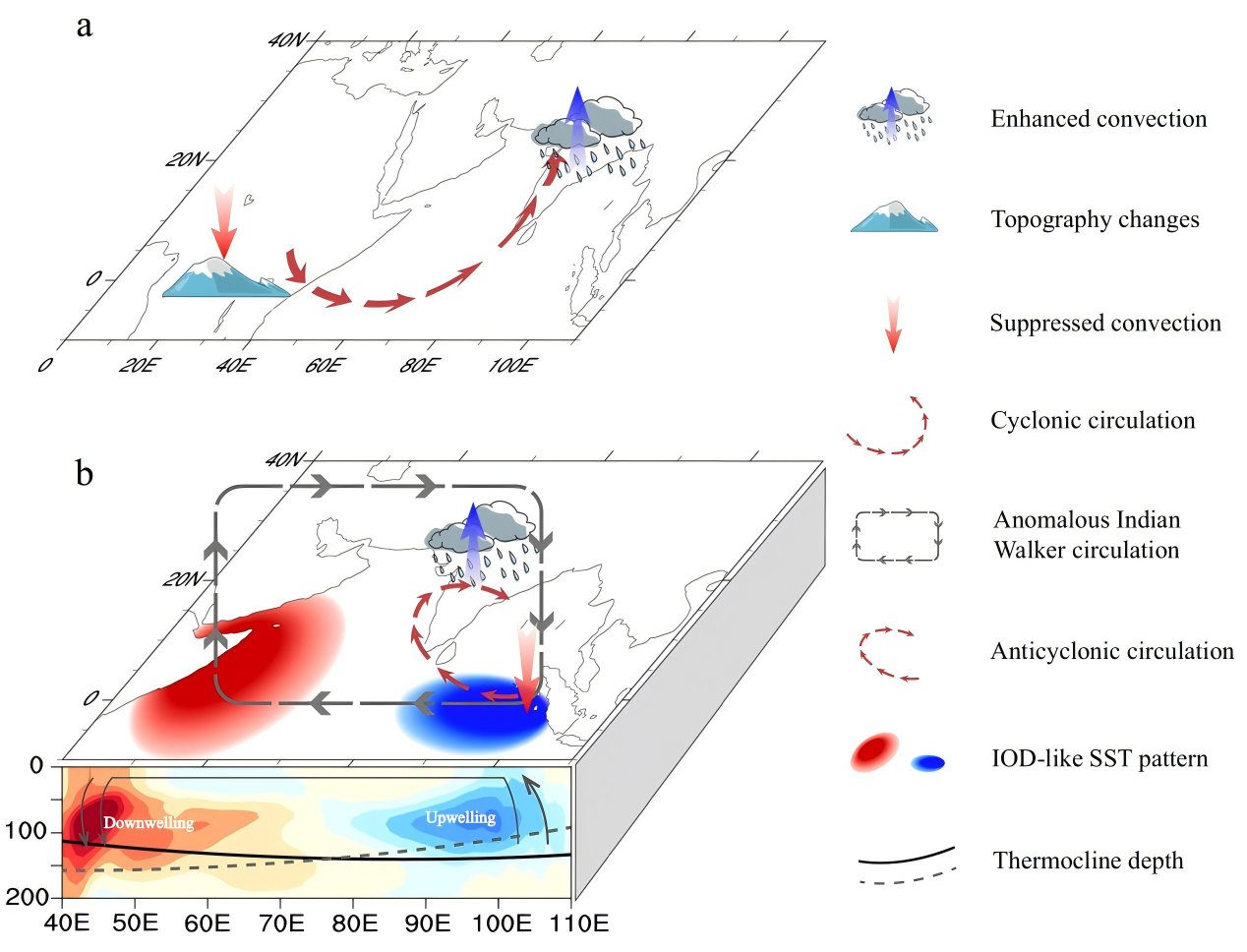 为了解决上述问题,该研究利用全耦合的高分辨率EC-Earth3模式,探究了25 Ma(早中新世)、15Ma(中中新世)和5Ma(晚中新世)非洲地形演化对南亚季风的影响。该研究确定了中新世南亚季风环流和降水解耦的关键驱动因素:非洲地形的变化(图1)。模拟表明,中新世非洲地形的降低会削弱了跨赤道的索马里急流,减少了阿拉伯海西部的上升流,同时通过诱导阿拉伯海上空的大气环流异常而增强了季风降水。而减弱的索马里急流会促进了印度洋正IOD-like的建立,通过海洋-大气正反馈过程进一步促进了季风降水(图2)。以上发现调和了风和降水指标之间的差异,并强调了非洲地形在形成SASM系统的多阶段演变中的关键作用。