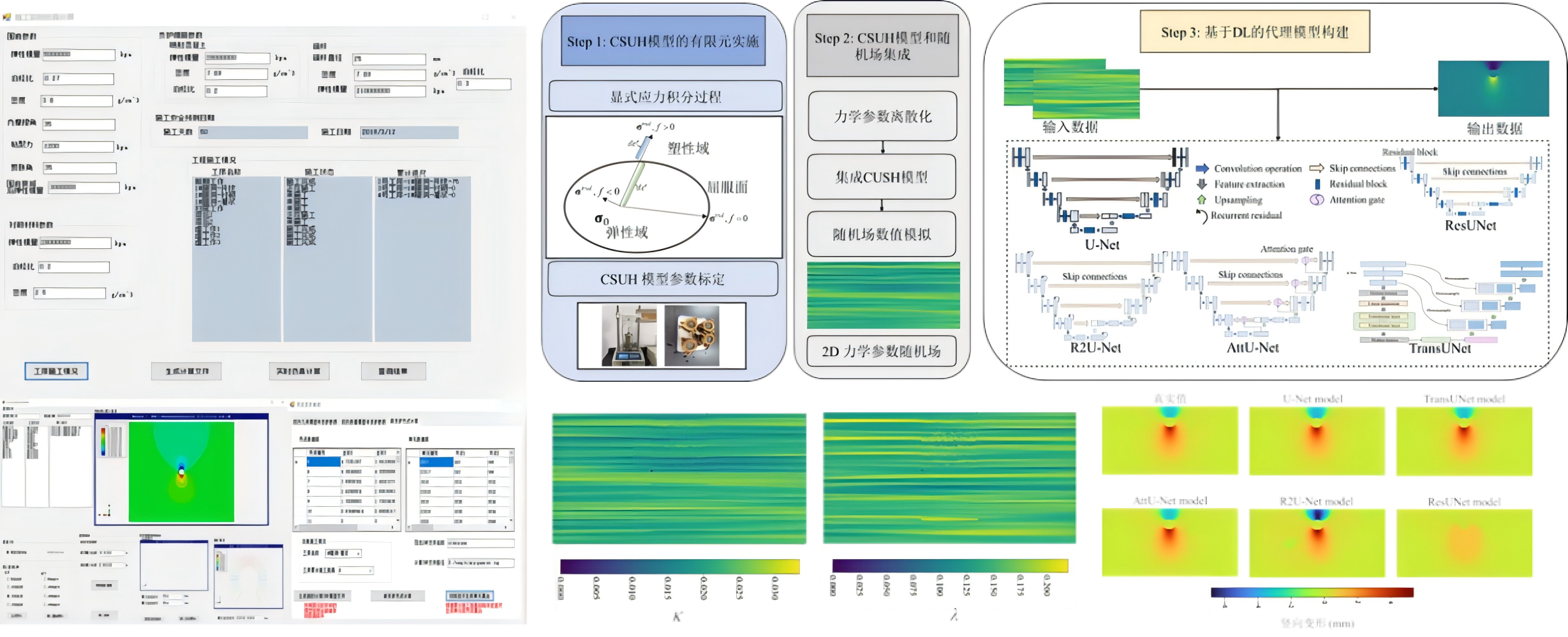 针对设计和施工阶段的隧洞稳定性分析,常规的计算方式难以实现与施工进度相适应的数值模拟,设计了一个集成施工仿真、围岩稳定分析和支护方案优化的平台,有效促进了施工进度信息和数值模型信息的语义交互,为施工方案制定提供支持;针对复杂本构模型的数值计算过程需要消耗大量的时间成本问题,采用基于U-Net架构的深度学习模型构建代理模型。将力学参数和变形场数据转为图像格式输入深度学习模型,实现“物理场”数据的预测,相比于常规的时空序列预测模型,能够提供高效的地层稳定评估解决方案(图2)。