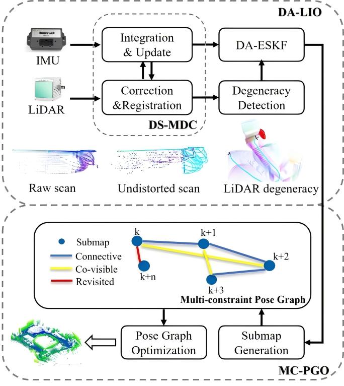 近期,英国365集团公司官网地球科学与工程学院何秀凤教授课题组及其合作者在《ISPRS Journal of Photogrammetry and Remote Sensing》上发表了题为“DALI-SLAM: Degeneracy-Aware LiDAR-inertial SLAM with novel distortion correction and accurate multi-constraint pose graph optimization”的研究论文。激光雷达-惯性同步定位与建图(LiDAR-Inertial Simultaneous Localization and Mapping, LI-SLAM)在机器人定位导航与低成本三维建图等应用中发挥了至关重要的作用。然而,现有LI-SLAM性能仍受限于运动畸变校正与位姿图约束不准确以及LiDAR特征退化等问题。现有的FAST-LIO2方法借助惯性测量单元(Inertial Measurement Unit, IMU)进行运动畸变校正,但IMU积分的累积误差导致越靠近帧末的激光点校正误差越大。此外,固态LiDAR(如Livox Avia