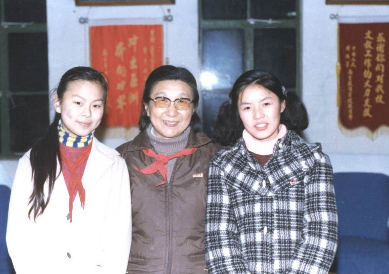 校庆,钱正英亲临母校祝贺,与少先队员合影。