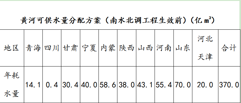 1987年,国家计委、水电部以黄河年度可供分配水量以及沿河各省、自治区、直辖市1980年的实际用水量为基础,综合考虑了各地农业灌溉规模的扩大、工业和城市用水量的增长,根据节约用水、统筹安排以及需要与可能相结合的原则,经过与沿河各省、自治区、直辖市以及有关部门的反复协商,对当时预计的南水北调工程生效前黄河可供分配耗用的370亿立方米河川径流量进行了分配(见下表),形成了“八七分水方案”。